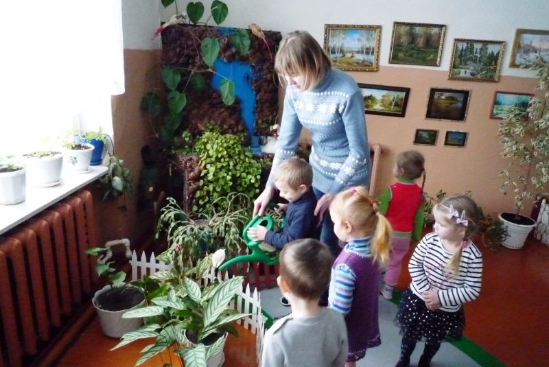 В детском саду организована работа по уходу за растениями в «Зимнем саду». Дети младшей группы вместе с воспитателем Жемановой С. Г. 25.01.2017 г. поливали цветы, рыхлили землю, убирали сухие листья.