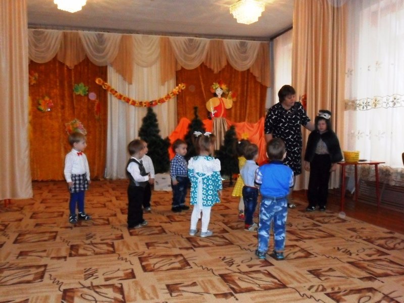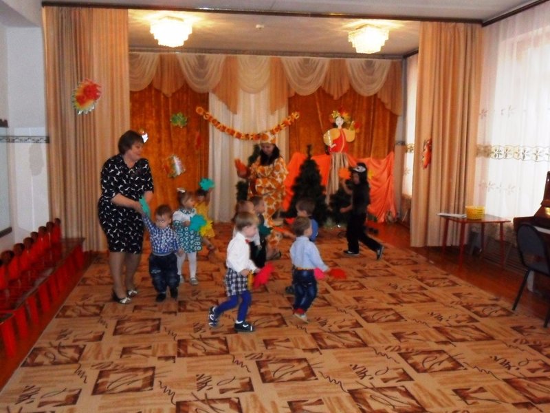 Малыши вместе с воспитателем пришли в осенний лес, где их ждал лесной житель-ёжик. Дети показали ёжику танец, а он предложил всем детям поиграть в игру «Солнышко и дождик». Затем ёжик помог ребятам и позвал к ним в гости Осень. Для гостьи дети исполнили танец «Сапожки», пели песню про дождик. Осень пригласила медвежонка к детям, дети спели для него песенку «Мишка косолапый».