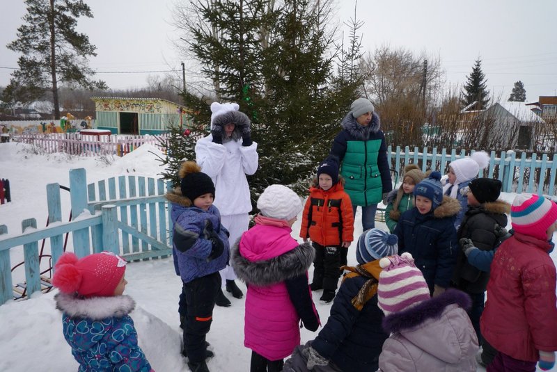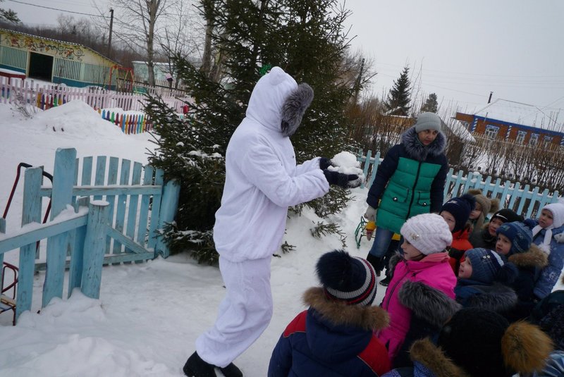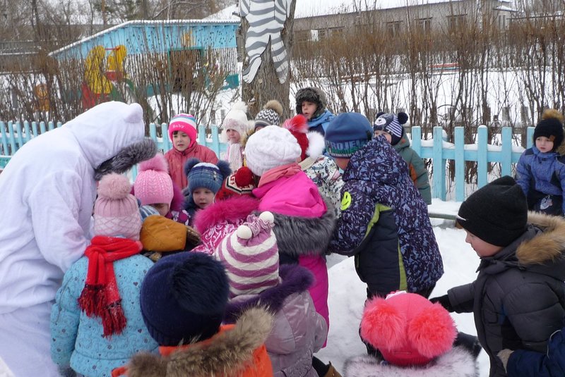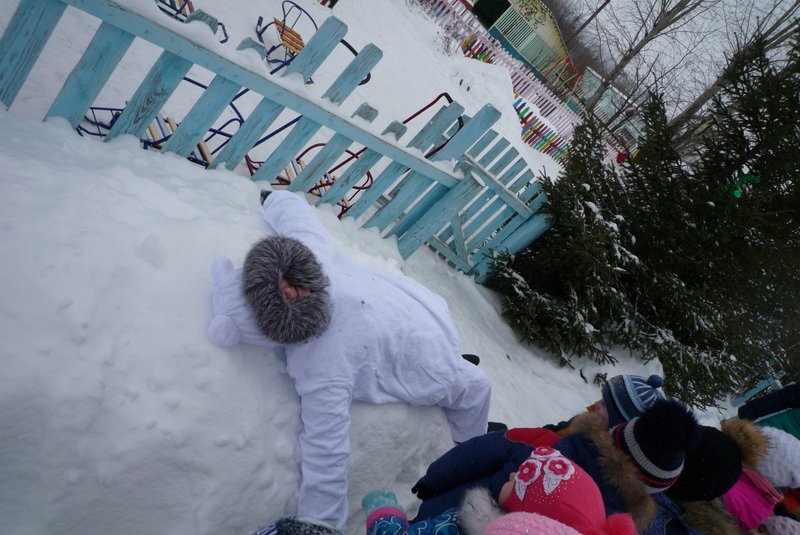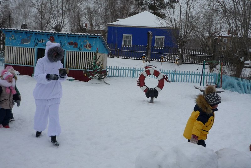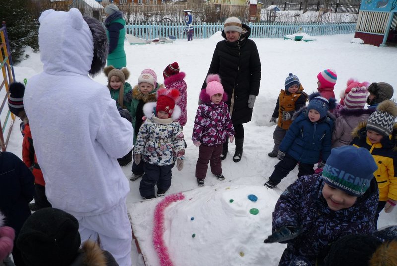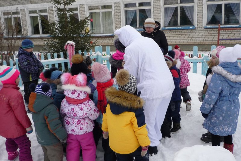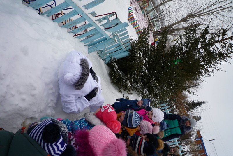 23.01.2018 воспитанники средней и старшей группы приняли участие в развлечении «День снега». В гости к детям пришёл Белый мишка (воспитатель Жеманова С.Г.), который очень радовался снегу, валялся в нём, хотел его съесть, но ребята рассказали ему о том, что снег нельзя есть - может заболеть горло, зато из снега можно лепить снеговиков и снежки.