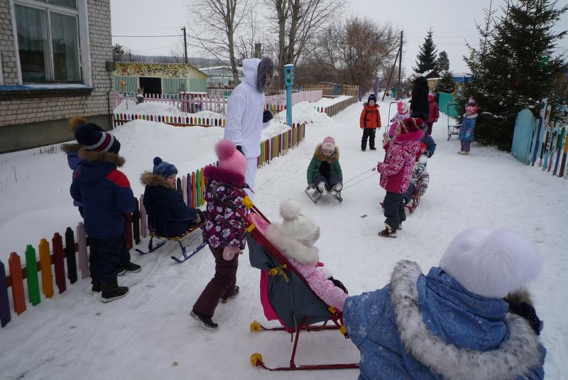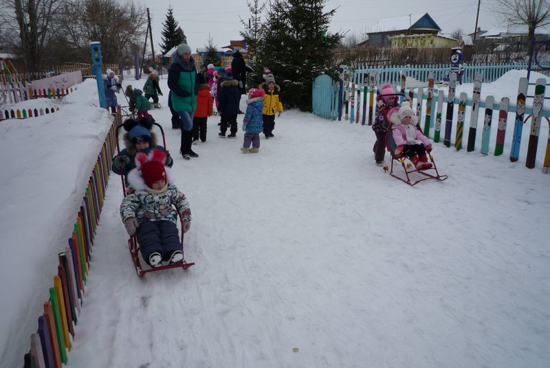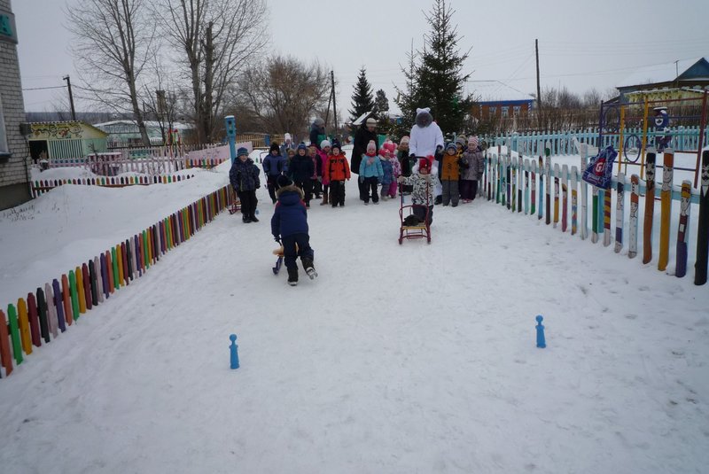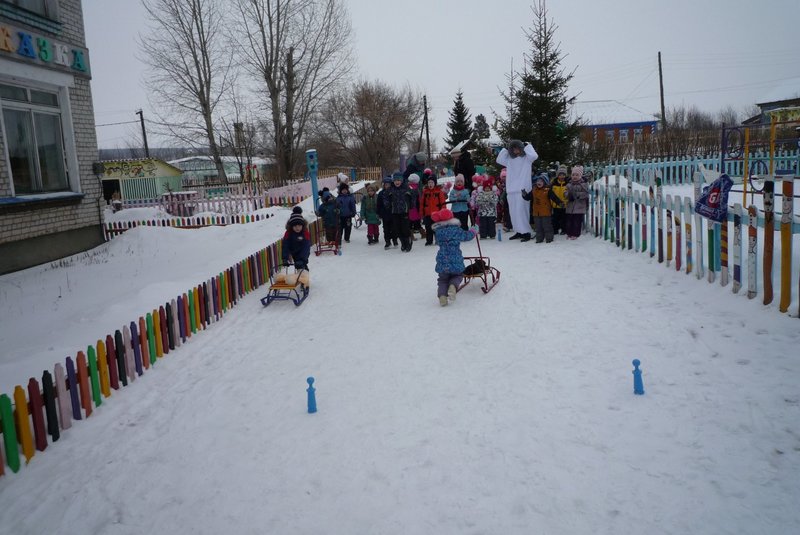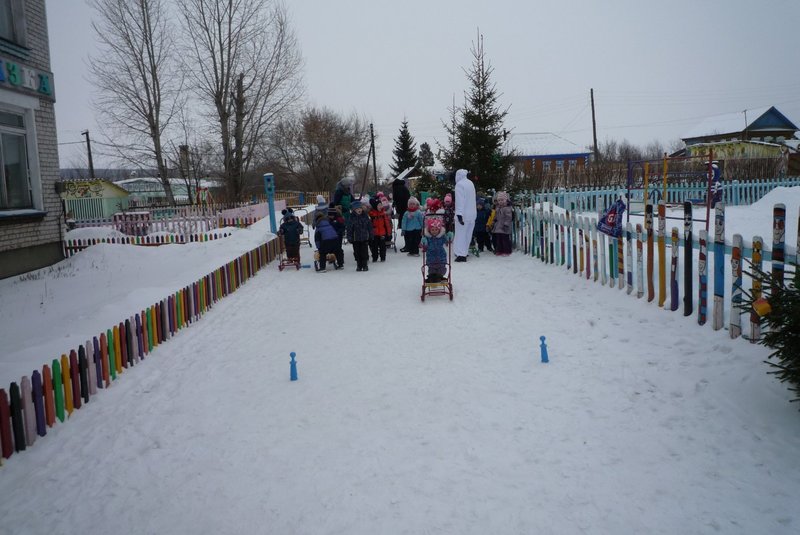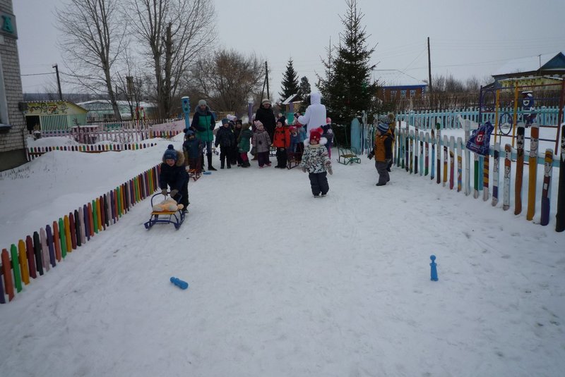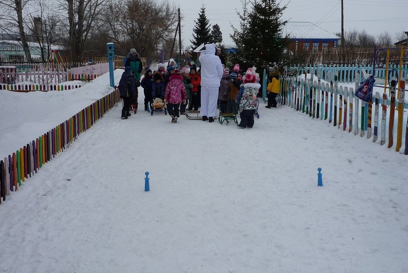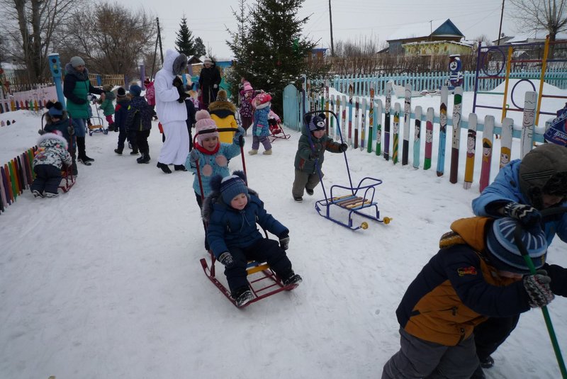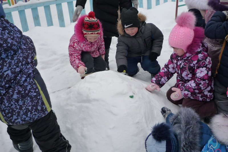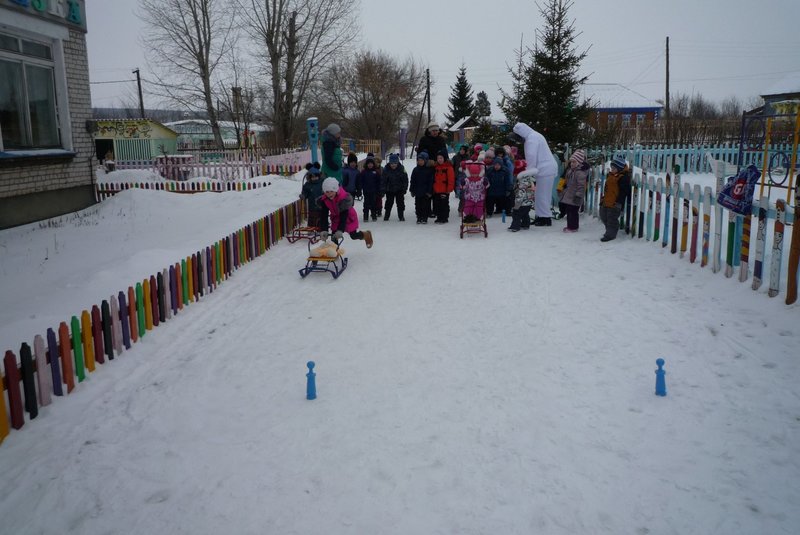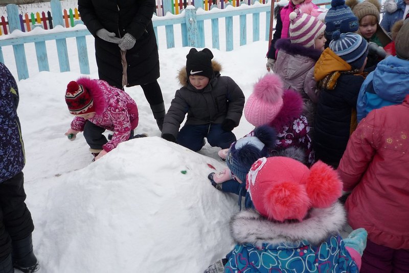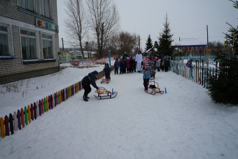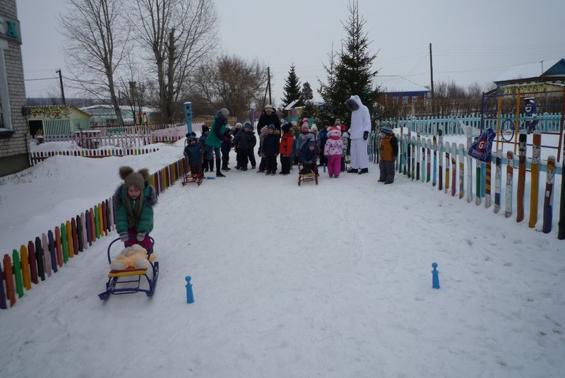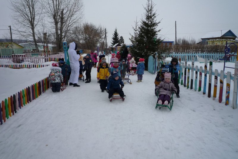 Дети поиграли с мишкой в подвижные игры: «Снежинки и ветер», «Снег пушистый нагребаем», «Снежиночки – пушиночки», «Кто дальше?», «Провези санки, толкая их», украсили разноцветными льдинками снежный торт и катались на санках. Все остались довольны развлечением!