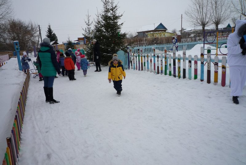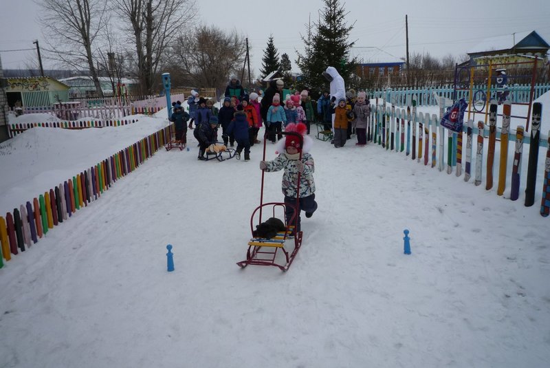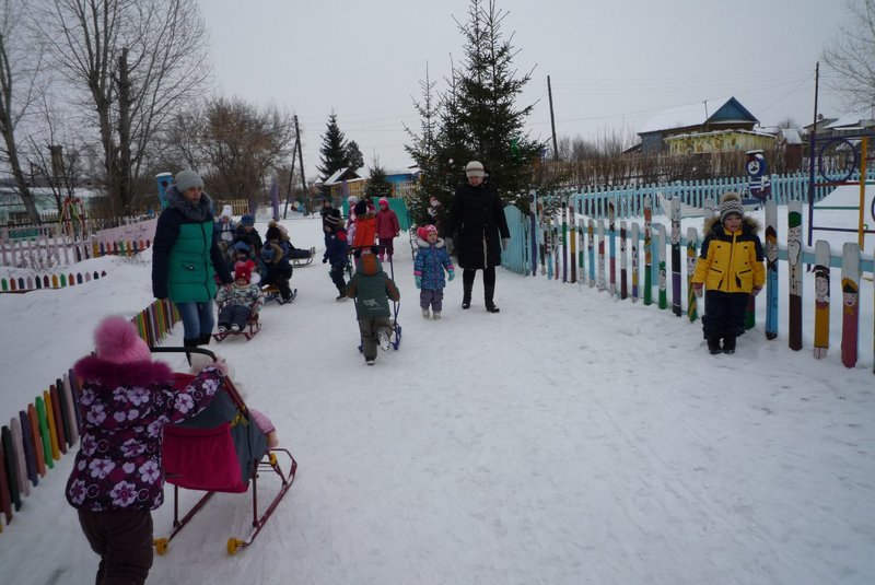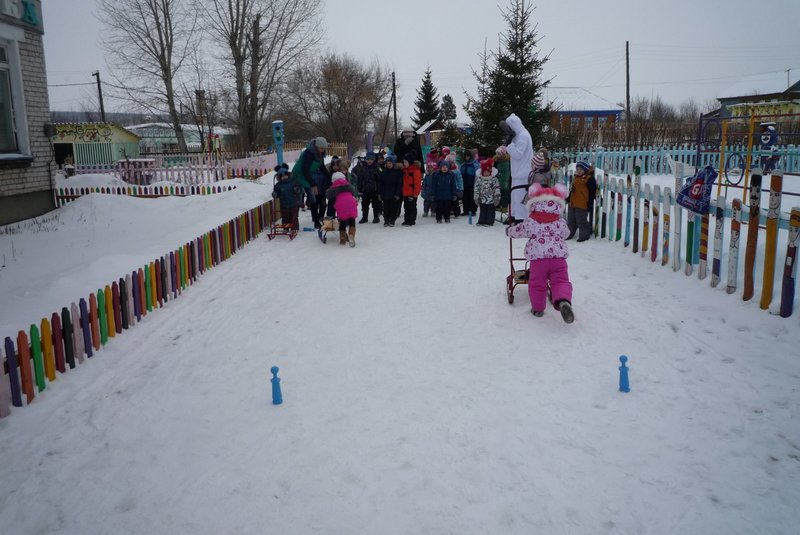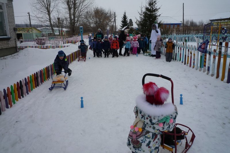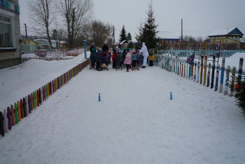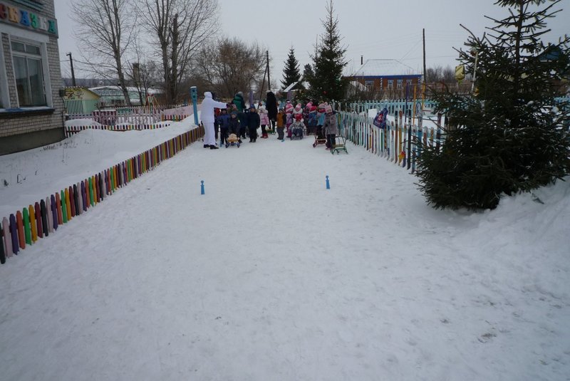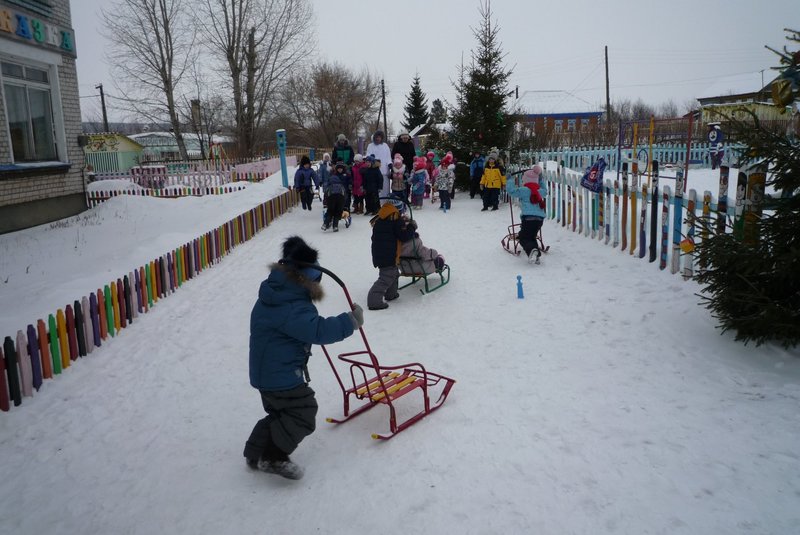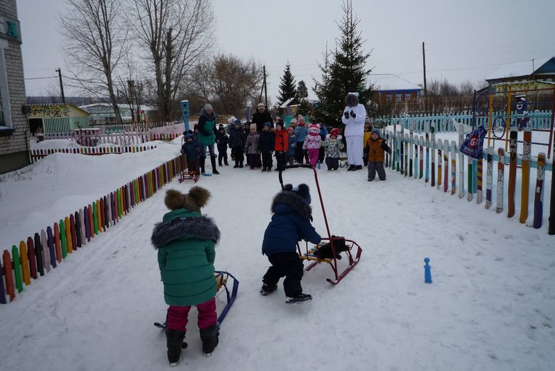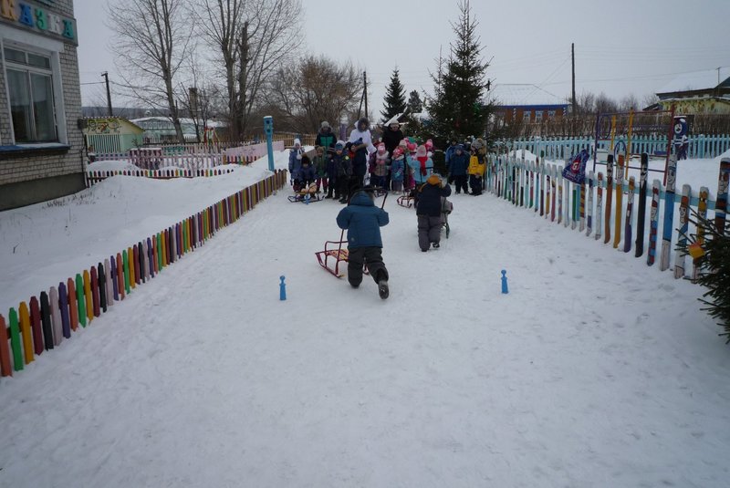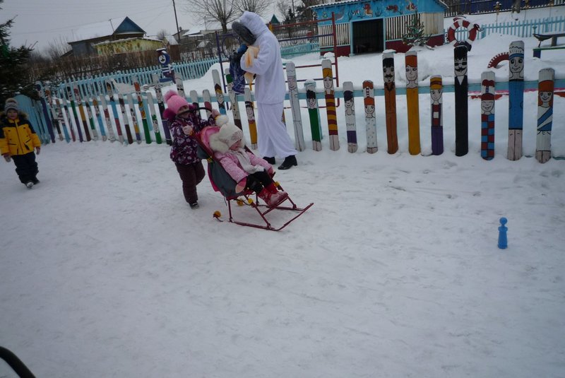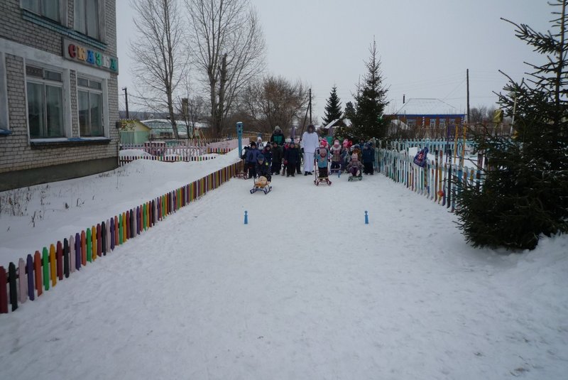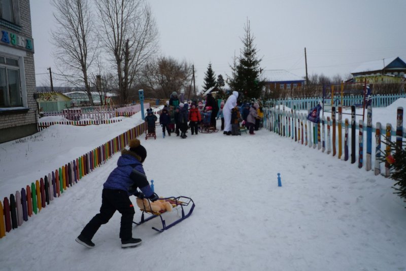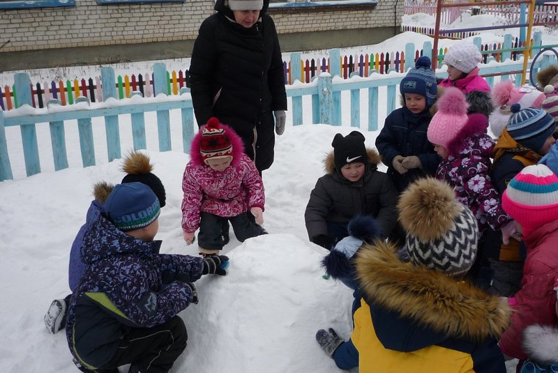 Дети поиграли с мишкой в подвижные игры: «Снежинки и ветер», «Снег пушистый нагребаем», «Снежиночки – пушиночки», «Кто дальше?», «Провези санки, толкая их», украсили разноцветными льдинками снежный торт и катались на санках. Все остались довольны развлечением!