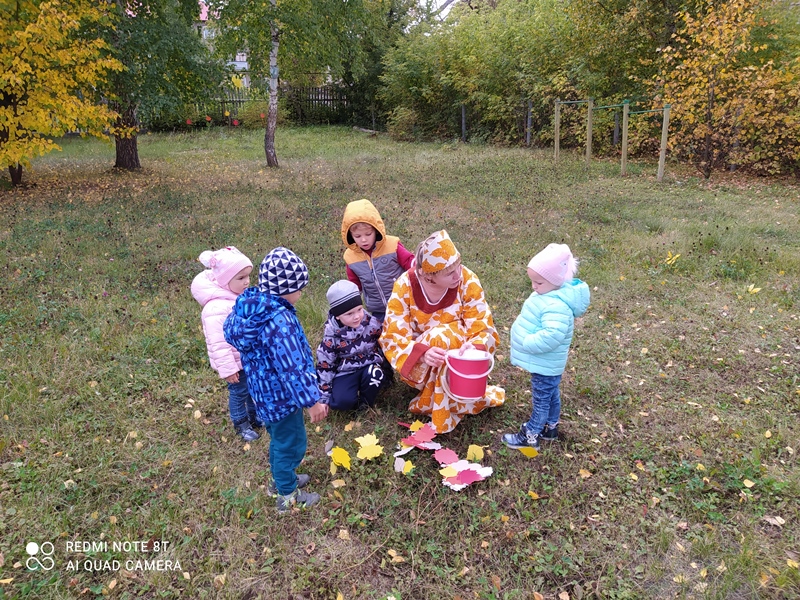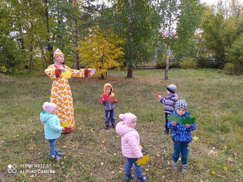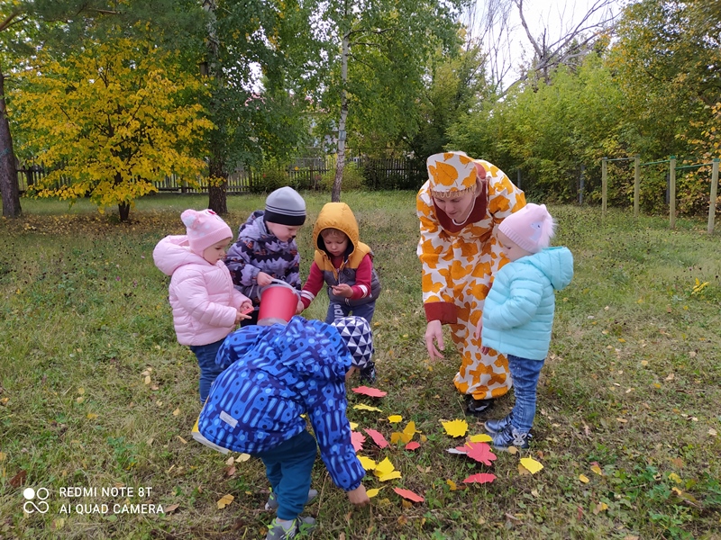Когда малыши прибыли в парк и рассмотрели листья на деревьях, Осень предложила поиграть с красивыми листочками. Ребята сделали зарядку с листочками, устроили листопад, сортировали листья по цвету, изображали, как ветер дует на листочки.