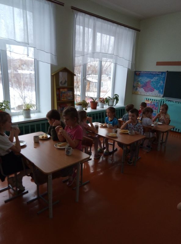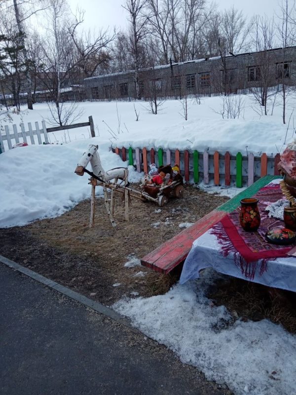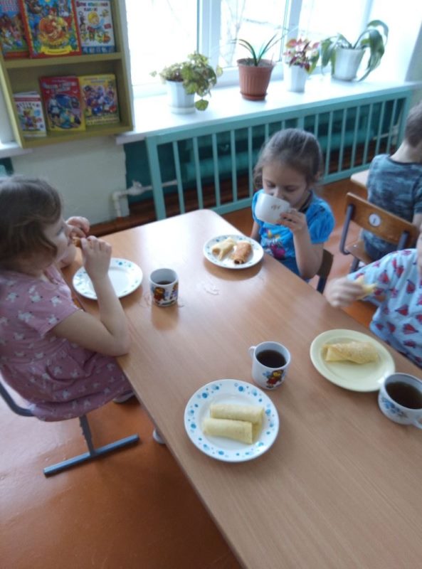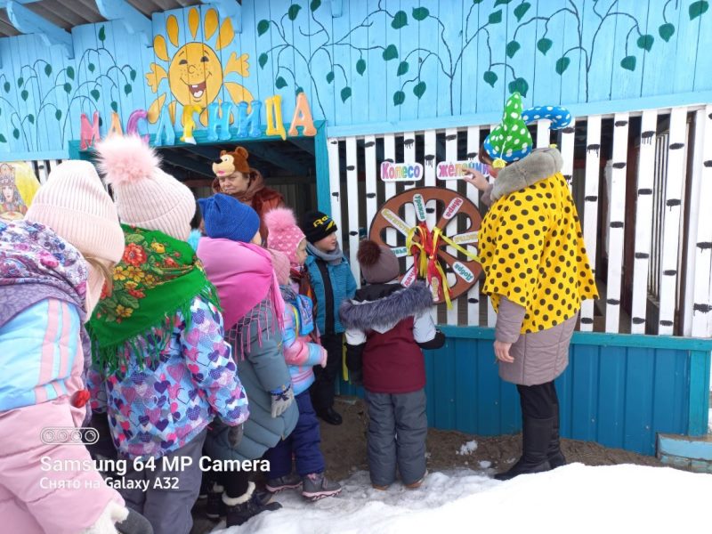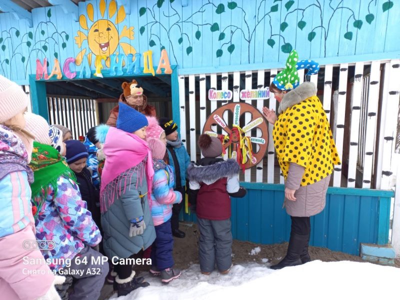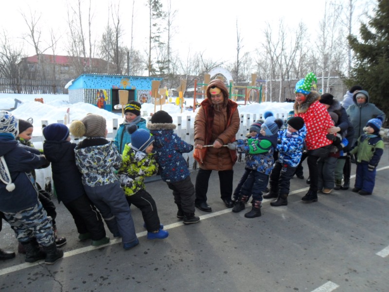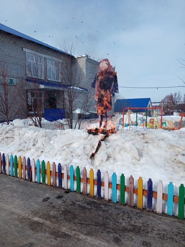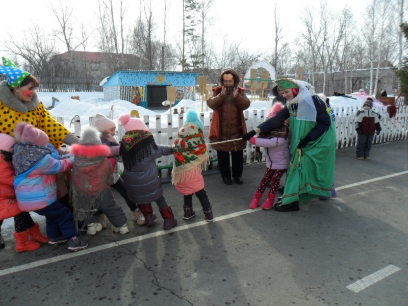 Сегодня дети закликали Весну, помогали ей разбудить Медведя, ходили в гости на блины к бабушке Матрёне, играли на русских народных инструментах с дедом Матвеем и тётей Глашей, ходили на ярмарку и загадывали желания у колеса желаний, состязались в перетягивании каната, катались на карусели, играли в народную игру "Гори, гори ясно", устраивали скачки на лошадях, добывали подарки у столба сюрпризов и сжигали чучелко Масленицы. А на полдник дети угощались блинами