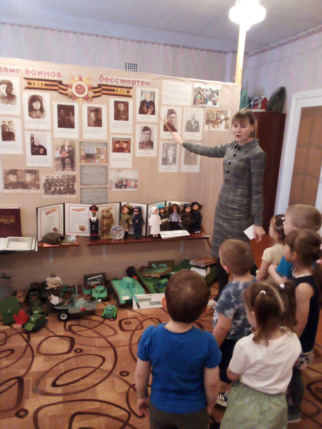Воспитанники младшей группы посетили музейный комплекс ДОУ. Познакомились с экспозицией "Подвиг воинов-бессмертен". Воспитатель рассказала детям о нашем земляке Жеманове Н.П., который воевал на Сталинградском фронте командиром отделения. Дети рассматривали альбом о Жеманове Н.П. "Дошёл до Сталинграда".
